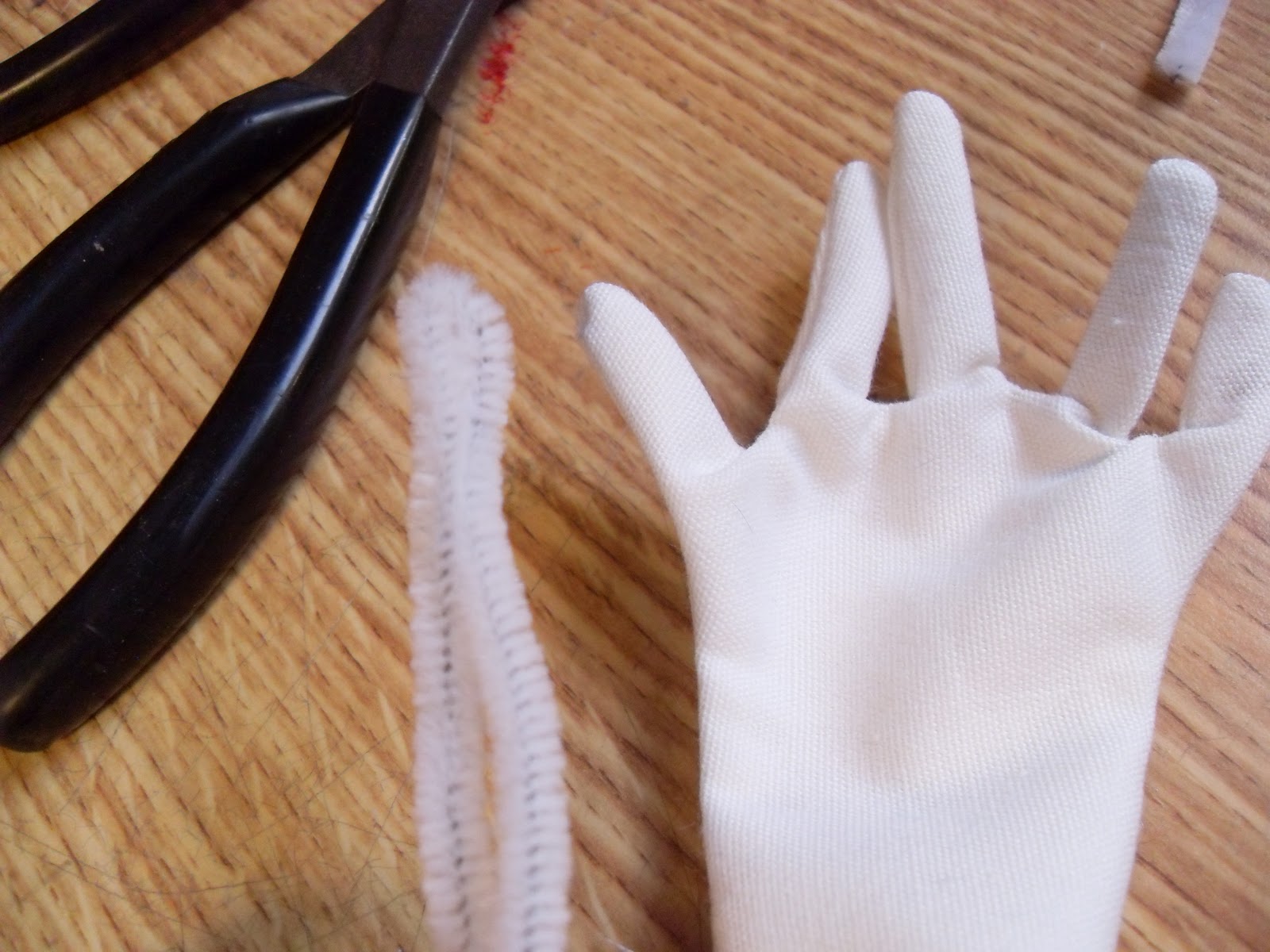 I am learning to use a sewing machine. The stitching and pattern for the hands of cloth puppets is tricky. Plus, I was using their "training material". It's rougher to work with, but it's a cheap muslin. So, I can afford to make mistakes. Pipe Cleaners are placed in the fingers after turning the hands. When turning, always turn the fingers inside out BEFORE the whole hand. This saves you the trouble of fishing them out later.